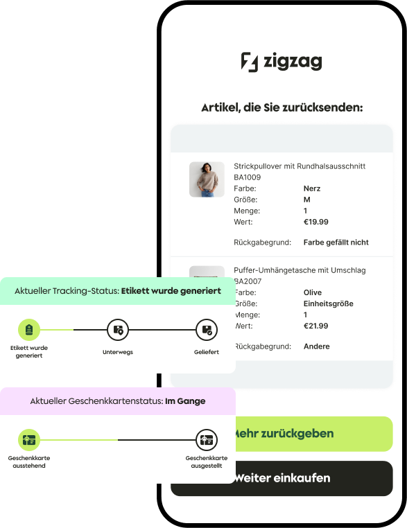 Auf der Tracking-Seite sieht der Kunde den Status des Rücksendepakets und den Status der rückerstatteten Zahlung auf die Geschenkkarte.