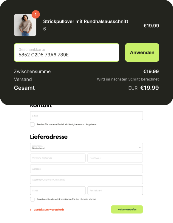 Der Kunde fügt den Geschenkkartencode einfach zur Zahlungsseite hinzu, wenn er seine neue Bestellung aufgibt.