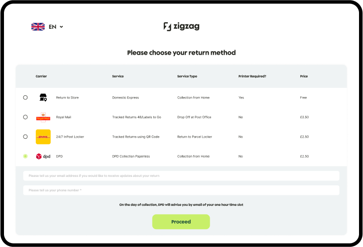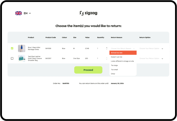 ZigZag enables you to offer free returns or paid returns depending on the return reason. For example, a retailer might want to charge for ‘Doesn’t Suit Me’, but offer free returns for ‘Arrived Too Late’ or ‘Damaged’.