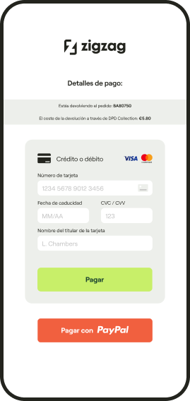 A los clientes se les cobra por adelantado a través de la plataforma de devoluciones en el momento en que solicitan su devolución (mediante tarjeta de crédito, tarjeta de débito, PayPal, Google Pay o Apple Pay). Nuestros clientes suelen preferir este método porque genera el mínimo de consultas al servicio de atención al cliente.