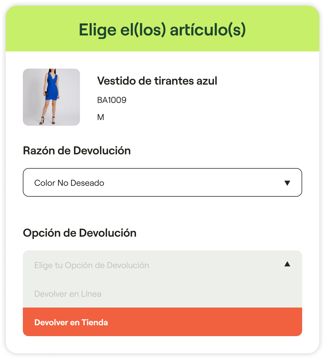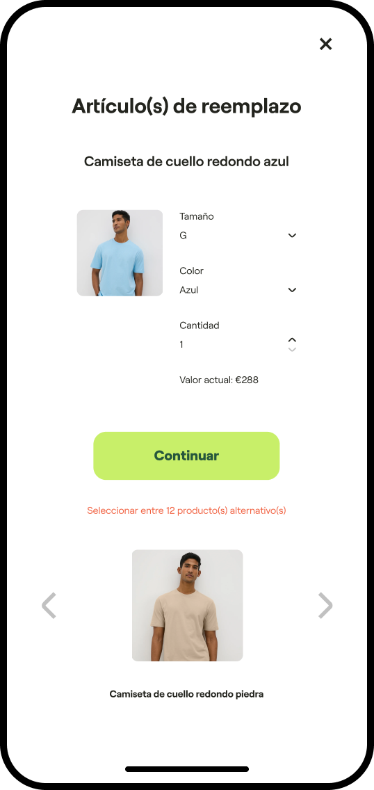 Los minoristas pueden establecer qué productos de su catálogo de inventario activo se muestran en función del motivo por el que se devuelve el producto. En función de los datos de inventario en tiempo real proporcionados por el minorista, se mostrarán diferentes tamaños, colores o diseños como productos alternativos disponibles para seleccionarlos para su intercambio.