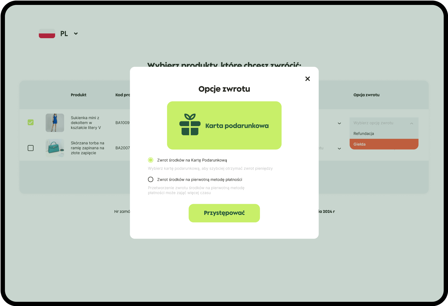 Sprzedawca może również wybrać, kiedy karta podarunkowa ma zostać wydana, tj. kiedy zostanie wygenerowana etykieta zwrotna lub kiedy zwrot został sprawdzony w magazynie.