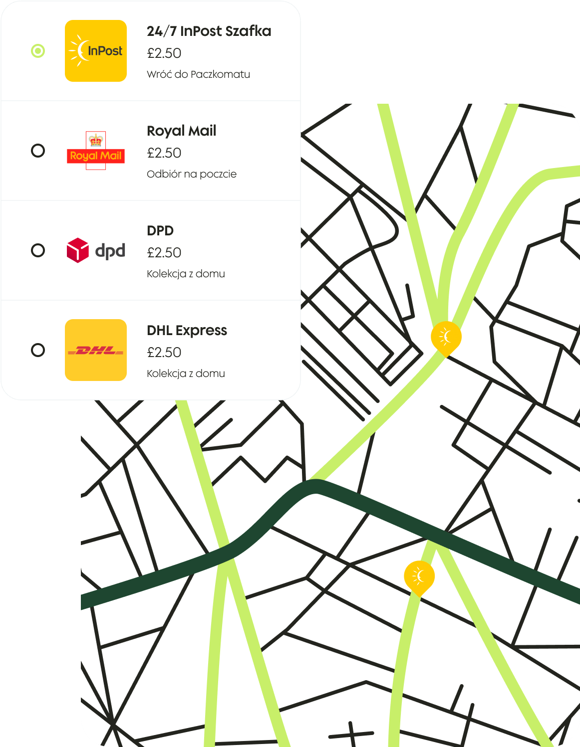 Klient wybiera najwygodniejszą opcję zwrotu (tj. odbiór do domu, poczta, sklep lokalny, szafka zwrotna) i otrzymuje cyfrową etykietę zwrotów.