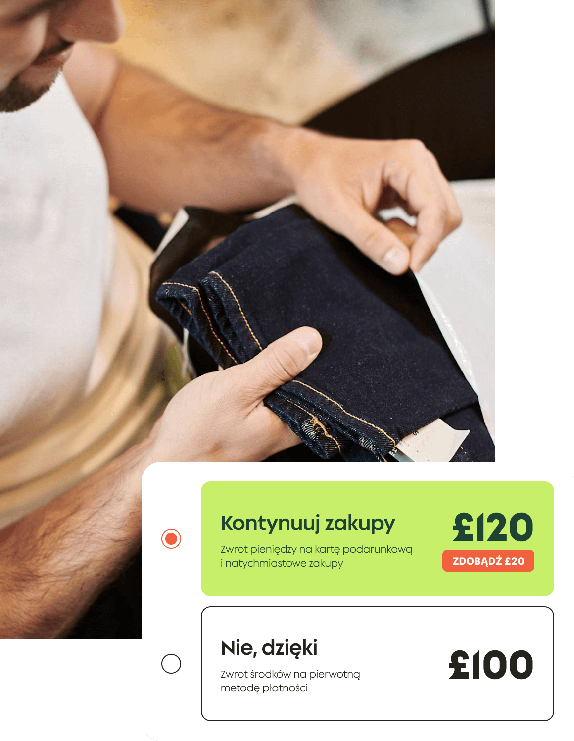 68% osób w wieku 26—35 lat wybrałoby kredyt sklepowy, gdyby zaoferowano dodatkową zachętę pieniężną o 10% lub 20%. Dlaczego więc nie zwrócić 110 GBP za pośrednictwem kredytu sklepowego w porównaniu do rzeczywistych 100 funtów, które otrzymaliby poprzez zwrot bankowy.