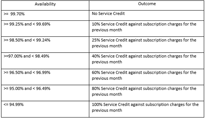 Should the Software uptime service availability drop below the contracted 99.80%, the following service credits will be payable to the Company.
